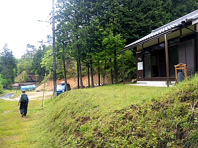 プレハブ建物前の草路から帰還し広場を眺めた場面。