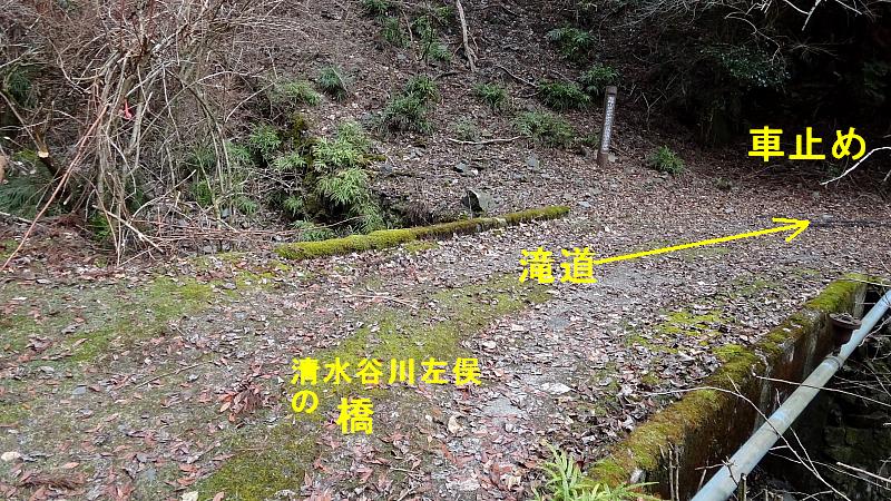 清水谷川は下流で左右に分かれ林道の遥か下に流れる深い谷のため左俣の川が上流で渡れる高さの橋が現れるまでは左俣の川の右岸を上流側に辿る路となる。