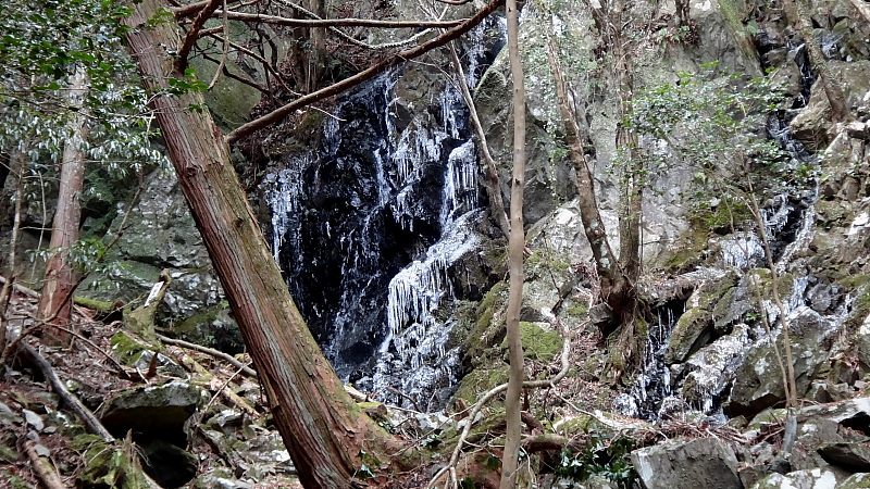 「五光の滝」の前を渡りずるずるに霜の降りた右岸を登って行くと部分氷結した「千手の滝」が見えてきた。11:23