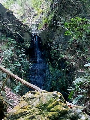 このレポを書く時点まではこちらの滝が「二の滝」と思っていたが京都府のHPの写真と形が違うことが判明。 「二の滝」は「一の滝」上流のようだ・・・。 左の写真は「一の滝」の落ちる左俣口あたりから見た滝上の遠望・・見えるかな〜「二の滝」〜?? 後日、「一の滝」の上の滝は無名滝と解り「上の滝(仮称)」としておきます |