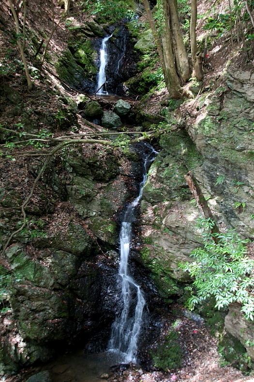 遊歩道から上覗きでみると上部の滑状の滝頭が落差を拡大錯覚させる効果があるようだ。