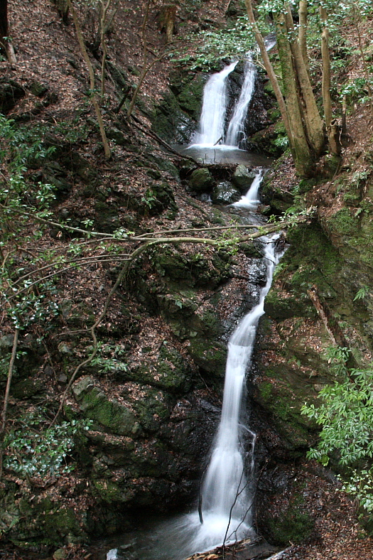 二の滝・一の滝 2009/02/28 京都市西京区大原野石作町 金蔵寺(こんぞうじ) 善峰川 落差:10m、3m 「藪滝(仮称)」から這い出してきたら4時半近い時刻になった。 多少あわてて「二の滝」「一の滝」の遊歩道に入った。 二本の滝が見下ろせる「産の滝」上流は滝壺に降りる必要がないグッドビューだ。 想像していたより落差がある。 両滝の中間の小滝は「二の滝」の所属か? ひょっとすると堆積している枯れ葉を取り去ると渓流になってしまうかも・・? 「一の滝」は二条の滝だが先日の降雨水量の影響かも? 谷側に少し下った大木に寄りかかってあっさり手撮りでひきあげた。 |