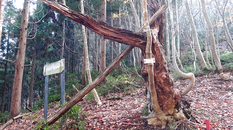 刑部(きょうぶ)滝 (上の滝/下の滝) 2015/11/11 京都府京都市右京区京北上弓削町八丁山/ 刑部谷八丁川上流 落差:上の滝:15m/下の滝:8m 滝の向き=南西 こちらの画像は帰還時に撮ったものでこの老木は果たして何人の人間を見てきたのか? ・・と感傷にふけった。 行きと帰りの時刻差が3:16後の15:08だった。 この季節の日没は16:50ということはもう1時間遅く帰還すると出発点のバス停で日没となってしまうことになる。 バス停は山の谷間にあるので日没の実感は更に早く感じるはず。 つまりもう1時間ではなくもう30分遅く帰還する15:30ダンノ峠帰還がリミットということになる。 |