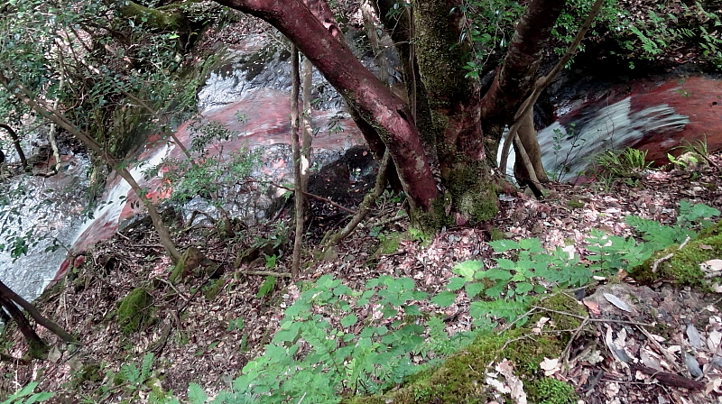 大滝と言うほどの落差でないが赤い滝床が印象的。