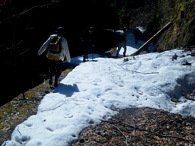 音谷の滝 2012/04/08 京都府南丹市美山町豊郷洞地区 西川支流洞谷川 林道洞谷線 落差:40m 滝の向き=北 徐々に高度を上げていくと、林道に残雪が現れ谷底にも吹き寄せの積雪が大量に見えた。