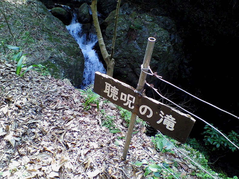 経岩から300m程上流に「聴呪の滝」の標示と大岩の間を落ちる流身が眼に入る。