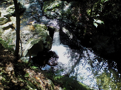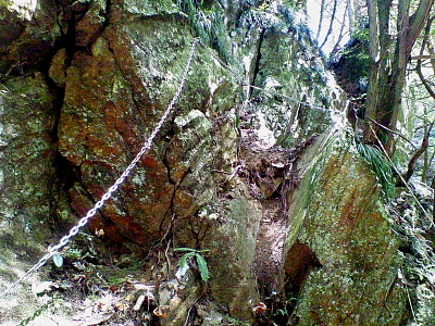 鎖を伝って6〜7m下りると・・小滝が見えた。この程度の滝ならこの渓谷にはごろごろ落ちている。 更に下りると半島のように出っ張りテントが張れる程の平らなスペースがある。 その傍の大木が倒れた流れの下に轟音をあげている滝が目に付いた。 これは立派な滝だが撮影できる場所がない。 携帯のカメラを精一杯手を伸ばしてめくら撮り・・。 「経岩の滝(仮)」としよう。見に行かれる方は自己責任で・・・。 |