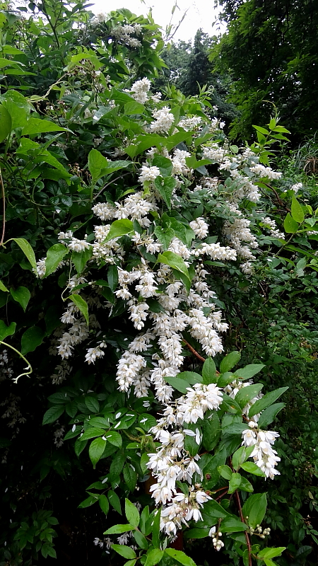 施錠された林道口に車を置いて舗装林道に入ると、白ウツギの花が満開で気分を和ませてくれる。