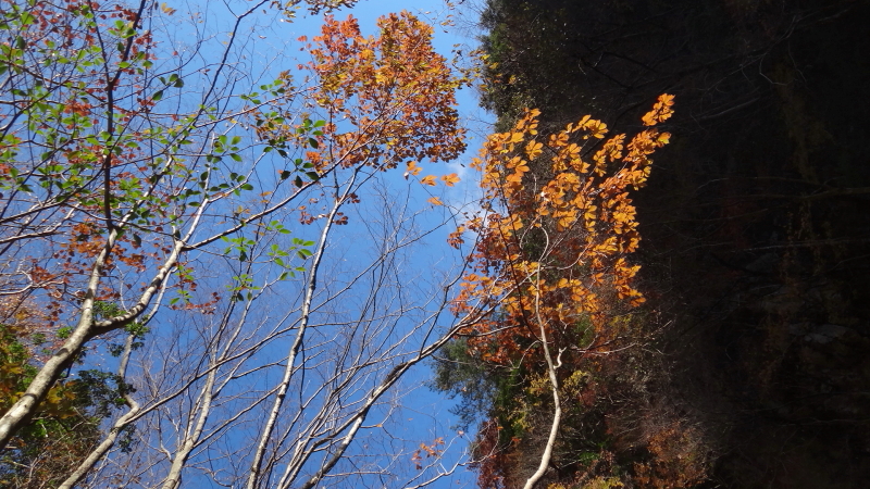 そうと解れば急ぐことはないので「庵座の滝」下流の「前衛滝3m」前に(岩飛び渡渉)して上空の終わりかけの紅葉を眺めたり絵にならない前衛滝でも撮りながら休息し後続でやってきたパーティーに前衛滝左側の設置鎖の順序を譲る。9:01