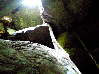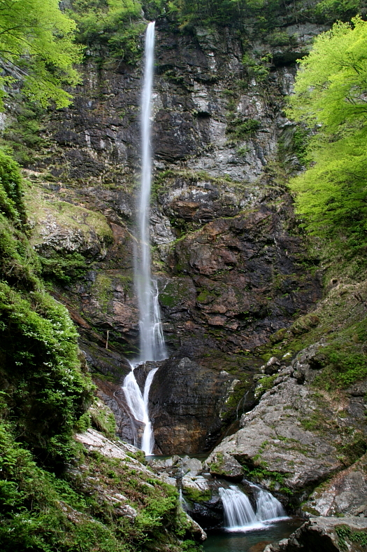 風折滝 2009/05/04 三重県松阪市飯高町蓮 水越谷 落差:蛇滝5m、風折の滝70m、高滝50m 滝の向き=蛇滝:(宮の谷)北、風折滝(水越谷):北、高滝:(宮の谷)東 ![]() 登山道としては整備されてなく沢を登って行くより路はない。 第一関門の「濡れ岩穴登り」を一人づつ這い上がるのだが、ザックを背負っては穴を通過できない。 ロープでザックを吊り上げた後、足を掛けるポイントがままならない濡れ岩に抱きつくようにして垂れ下がっている輪になった布ベルトに片足を掛けて細い虎ロープで体重を自己懸垂してよじ登るのが正解のようだ。 全員通過に10分ほど要した。 |