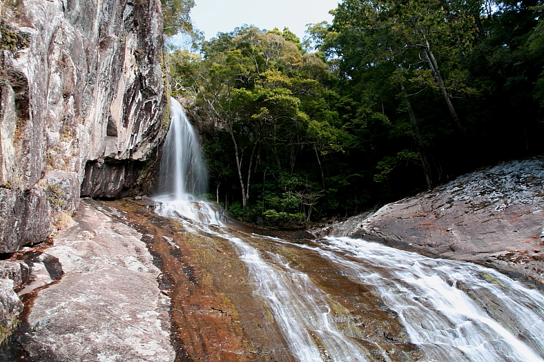 正面前右岸に鎮座する大岩を乗り越え右岸の岸壁の下に出ると滝は別の表情をみせてくれる。