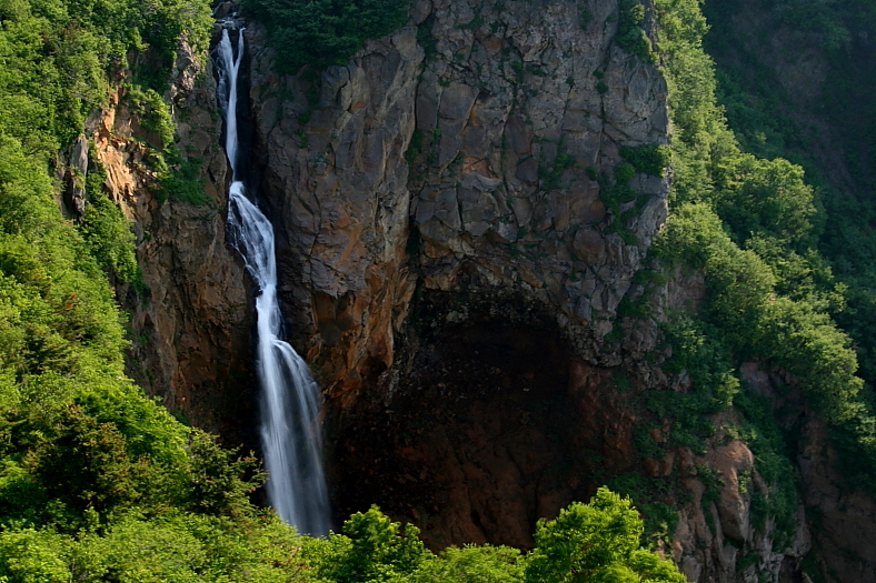 不帰(かえらず)の滝 2009/06/26 宮城県刈田郡蔵王町遠刈田温泉 濁川上流 落差:97.5m 滝の向き=東北 蔵王エコーラインの駒草平展望台からみえる。 看板、駐車スペースあり。徒歩数分。 訪れる人が帰るのを忘れて見惚れるという。 お釜から流れ出る水が溶岩台地の上を流れ落ちている。
