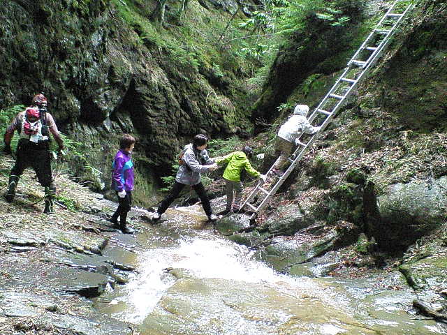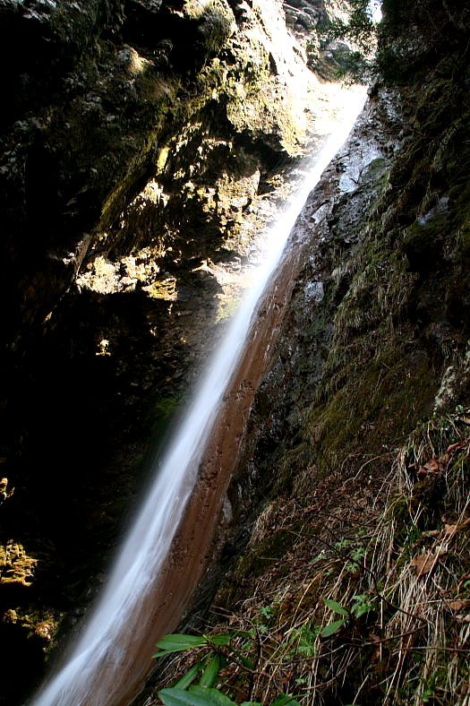 あれ?どっかで見たポーズと見回すとあじゅおとうさんもポーズをきめている。御来光の滝壷で決めたモンキーポーズはさすがに双子ちゃんの手前セーブしているようだ。 発想の貧困な我輩は醤油樽に閉じ込められた囚人のごとく只天を見上げてうろうろするだけで気に入った写真が撮れなかったが充分に奇瀑の形は脳裏に焼きつけさせられた。 |