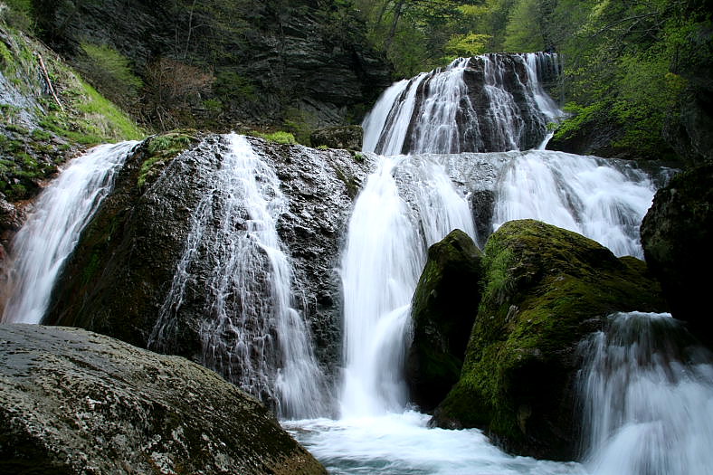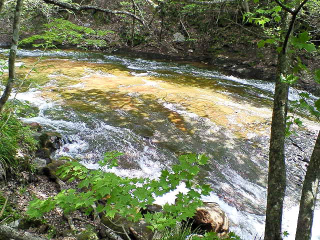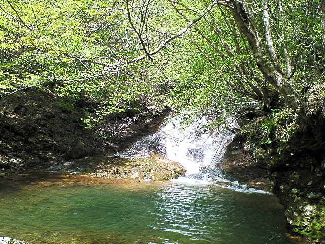 遊歩道を更に辿る上流は渓流透明度があがり無名の滑が連らなるのが木の葉隠れに見えて傾斜があがってくる。