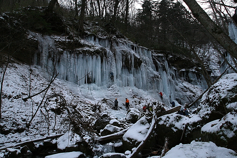 湯川の氷瀑氷柱群 2008/01/20 長野県南牧村海尻 14:27〜15:03 既に先客の車がかなりあるも氷柱見物にしては人数が多いなと思いながら河原へ降りていく。 カメラ老人(失礼(>_<))が立派な機材を携え帰ってきた。 写録の旅人さんが 「湯川は渡れましたか?」 と訊ねると 「いや〜落っこちましたよ。」 と、すごすご帰っていった。 この気温で川に落ちるなどトンデモナイことだ。 「牛首の水滝」を撮り上流に向かうと信じられない光景が眼に入ってきた。 身長の4〜5倍もあろうかという”つらら”ならぬ”氷柱”が林立ではなく垂れ下がっている。 それに若者が攀じ登っているではないか・・・ 中には女性クライマーも。 |