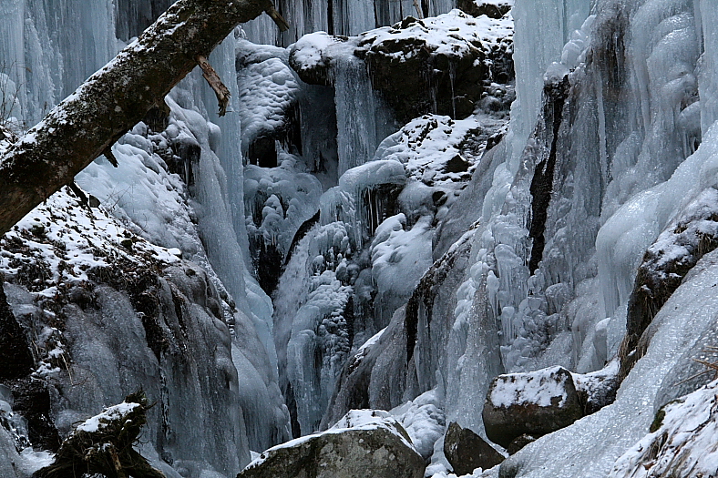 氷柱群の奥に「牛首の滝」がわずか氷結しないで流れ落ちている。