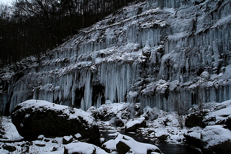 アイスクライマー達のいた上流から下流に向かうと氷柱のサイズは小さいがより密集した氷柱群が現れ思わず息を呑む。
