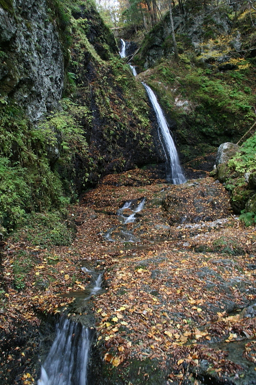 大天井滝(おおてんじょうたき) 2009/11/10 奈良県吉野郡川上村大字高原 高原川 落差:40m 滝の向き=北 10時半R169沿い道の駅「杉ノ湯川上」に立ち寄り情報収集。 「大天井滝」を目指す林道に入る国道口は意外な処だった。 写録の旅人さんは2回程訪れて慣れたものだったのだが林道に入ってから記憶を手繰り寄せるのに多少手間取ったようだ。 滝到着が11時43分は其の為で通常なら道の駅「杉ノ湯川上」から3〜40分の距離だ。 なかなか雰囲気のいい滝前は「大天井滝」の名がぴったりのオールシーズン向きの滝だ。 11時43分到着し20分ほどくつろいだ後、道の駅「杉ノ湯川上」に帰還して山菜うどんを食べた。 |