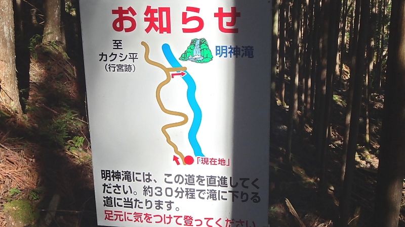 明神滝 2017/11/21 奈良県吉野郡川上村神之谷/三之公川 落差:30m 滝の向き=南 おおよその中間点にこんな立札の案内。約30分経過。 川に橋がかかっているかのような図ですが滝はこの三之公川に落ちていて橋など有りません。 滝前の滝壺もそんなに大きなものでなくせいぜい6〜7mRくらい。 滝壺前が平らな砂地の河原と大岩が数個川下側に点在していて滝の全景は砂地の河原から35o焦点のレンズでギリギリ滝全景が入るか? 滝の向きが南なので10時頃に到着すれば虹が見られるはずです。 飛沫が多いので晴天なら日陰にならない限り昼過ぎまでランダムに虹は出ると思う。 |