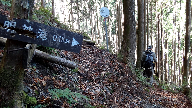 最後に20m程の急坂の途中でこの立札が出て来て、ここから谷の滝前まで60m程の高さを下って行きます。