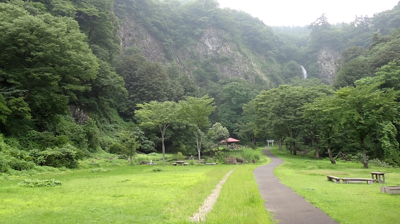 非の打ちどころのない芝生広場の景観の奥に「糸滝」と「不動滝」が見えてくる。