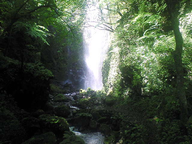 乙原(おとばる)の滝 2008/07/07 大分県別府市大字別府乙原 落差:60m(雄滝)、30m(雌滝) 百選滝以外は殆ど知らない九州の滝。 百選滝も不完全燃焼で終えた滝があり何時か再訪したいと考えていた。 一方、今回の九州徘徊に同行させていただいた(写録の旅人さん)は丁度一ヶ月前に九州の滝を巡り「ダブルパンチの九州徘徊」レポで不完全燃焼を記されていた。 お互いの思惑が奇しくも一致していた。 それにリベンジターゲットも「行縢の滝」「矢研の滝」と重なるのも奇遇だった。 梅雨明けを待つまでも無く週間天気予報は晴れマークが続く異常気象、善は急げと日程繰上げで出発進行。 ★7/6(初日) 名神高速バス停で合流、一気に関門海峡手前の"美東SA"まで駆けた。 熱帯夜初日、大型トラックのクーラーアイドリング音に悩ませられながらも、打ち消し痛飲で就寝。 ★7/7(二日目) 東西2Gは、5時には行動開始し関門海峡6時すぎ小休止。