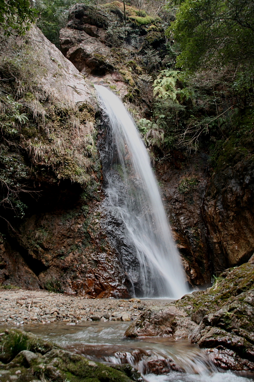 権現滝 2009/03/09 大阪府河内長野市滝畑 石川の支流横谷川 落差:15m 滝の向き=北西 写録の旅人さんは、屋久島の滝巡りを電光石火でこなし更に滝リベンジアイテムもこなし更にサブテーマの「神社」「仏閣」「銘城」巡りと何でもかんでも貪欲にこなした帰路に誘ってくれた。 何で我輩をさそってくれたのか?はどうでもいいのだが嬉しい限りだ。 当日、5時前に起きて写録の旅人さんに携帯入れると「走ってま〜す!」だ。 我輩のエンジンの起動が遅れをとっているようなので、緊急朝飯=”ネコまんま”を掻きこんで出発!! *********************************** (((画像パラレルレポ))) 滝畑48滝の最下流滝がこの滝のようです。 ルートが紹介されていないので殆どの人は見に来ることがないようだ。 滝上の岩の形や滝壺の岩が美しい通好みの滝だ。 滝畑ダム下流直ぐの第一トンネル南を抜けて左折又は塩降トンネル南をを抜けて1km程で左折し石川の橋を渡り直ぐの急カギ形細道を登って行く。 右の谷の横谷川水音に注意する。 「権現滝」のちっちゃな標示プレートが枝に吊り下げられている。 そこから20m程の設置ロープで木の根路を急下りで滝に降りる。 |