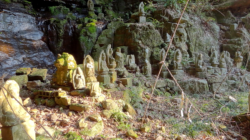 殆ど人の通った気配のない荒れた道の左の谷に滝音らしい水音がして間もなく観音像群が祀られ荒れた滝前に着くと朝日が射し独特の雰囲気だ。