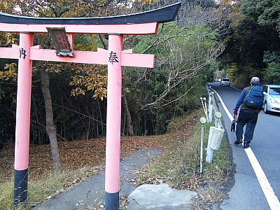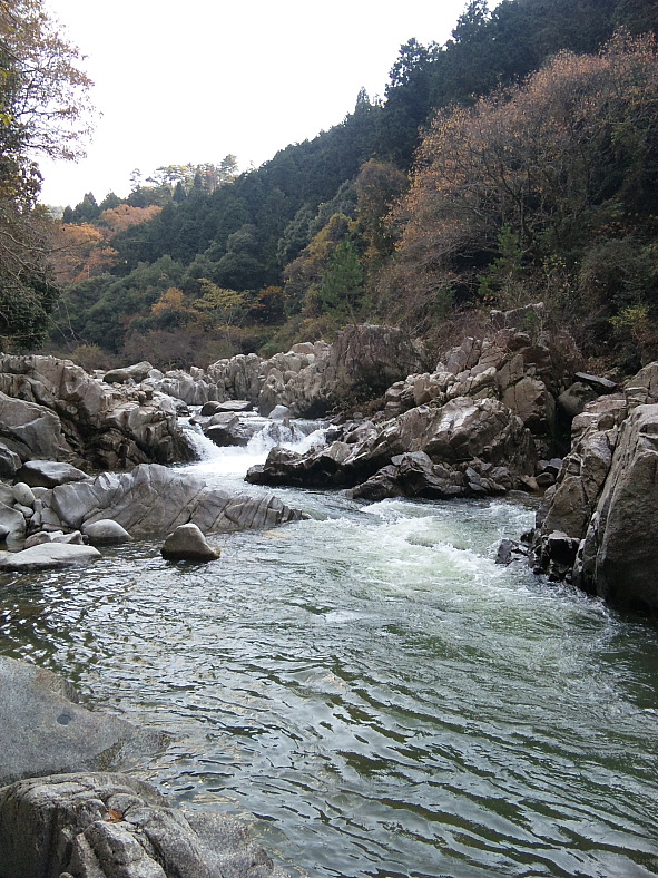 この写真は帰路に撮ったものだが鳥居を潜り河原に出ると景勝(駒ケ淵)。大岩群の間の急流を眺めながら昼飯。 ポットに詰めた湯で解くインスタント味噌汁とコンビニお握りで「斧研谷」で冷え切った体を温める。 車で行き来する人はこんな美景ポイントが大戸川にあることすら知らないだろうな〜 「ええ歳のおっさん2人ヒッチハイクでもあるまいに・・」と話ながら車が過ぎて行く・・・推測。 |