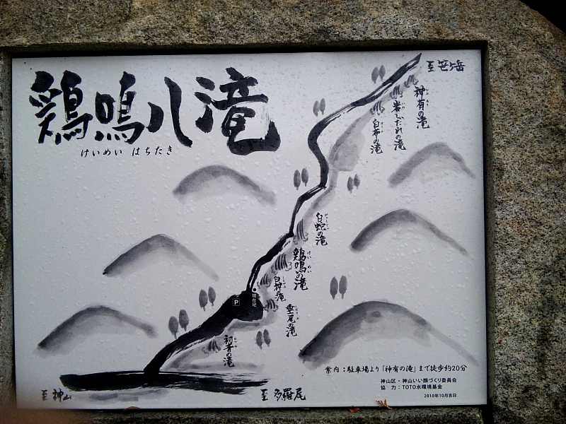八滝標示板 2011/12/30 滋賀県甲賀市信楽町神山(こうやま) 大戸川支流神有川(かみありがわ) 八滝の始まりはこの”八滝標示板”といっていいだろう。 なかなかセンスのあるデザインに”信楽焼きアート”の意気込みが感じられた。 以後。じっくりと時間をかけて見て廻った。 大きな滝は無いので「鶏鳴の滝」並の過剰な期待を抱かず気楽に周遊するのが良いと感じた。 オフシーズンということもあるが枯れ木や流木が目障りな滝もあった。 しかし過度な人手が入っている渓谷より自然のままを感じさせる方がまだ救われる。 |