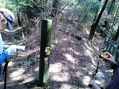 ジグザグ路を600m急登して東海自然歩道尾根道を「崇福寺跡」標示方向に行くとY字路分技のここでは右に進む。