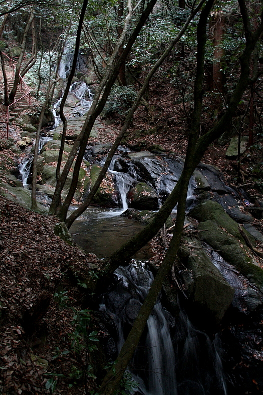 九品の滝(くぼんのたき) 2009/12/23 滋賀県栗東市井上 穴口川 落差:上滝(奥滝):約8m、中滝(大滝):約8m渓流瀑、下滝(門滝):約3m、渓流延長約100m。 滝の向き=北、標高240m 世界的大寒波が列島にも居座った1週間が過ぎた。 お陰で湖南の宿題滝であった「九品の滝」のアクセス情報が集められた。 レンタサイクルなど考えていたのだが近場までバスが運行していることが解り、我輩と同じくテクテク派の浅山さんを誘って出かけることにした。 当日、栗東駅に9時過ぎ降り立ち金勝(コンゼ)集会所まで25分程で到着。 のんびり田園風景など眺めながら1時間程で滝に到着。 途中で出会った住民のおやじに川の名を尋ねるも「知らん」という。 百姓が川の名を知らないで生活できるのか?と不思議で仕方なかった。 |