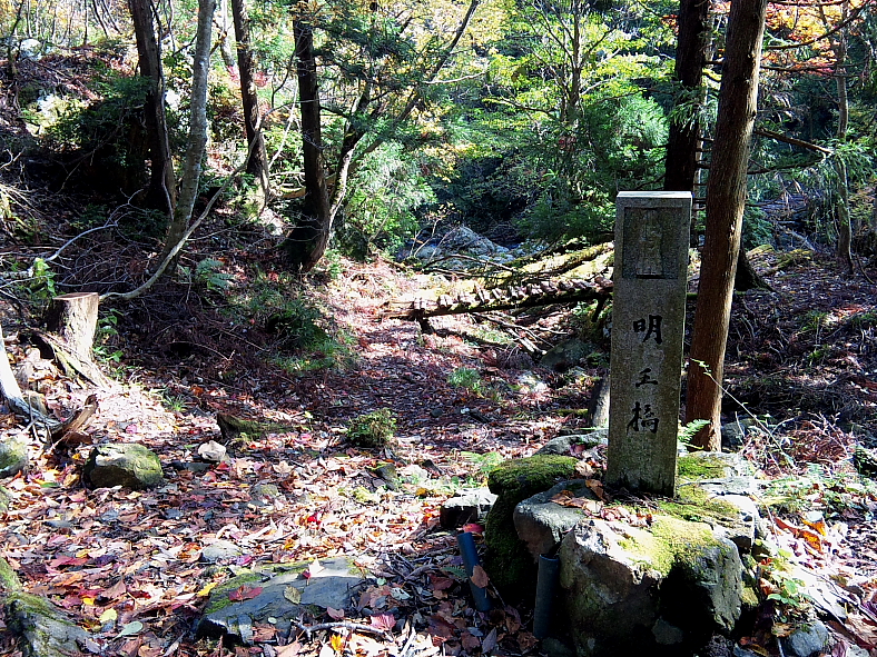 白滝谷には先程通ってきた小屋の建っている分技点まで引き返し「夫婦滝」上流「明王橋」の石柱から腐りかけた木橋で右岸に渡り高巻き路をしばらく登って沢から離れて「白滝」で再び沢に近づき終点の牛コバまで標高差380m、2.5km程の沢沿いの多少のアップダウン有りの下り路だ。