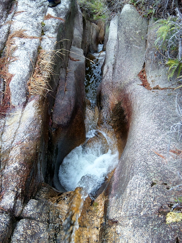 この岩路の左側の小さな松の木の傍に「お松の滝」が落ちる。