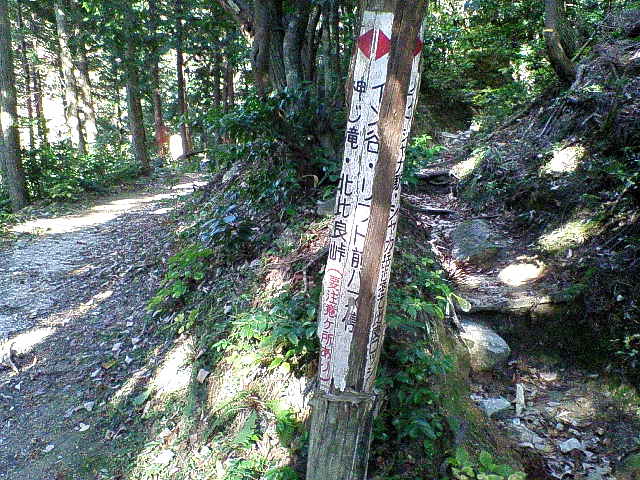 ここから左の登山路に入ってゆくと伸爾谷の左岸だ。 とり合えず虹時間の都合上、先ず雄滝を目指す。 ![]() 9:12 釈迦岳と比良峠の分技点到着。 滝は左の比良峠方向だ。 |