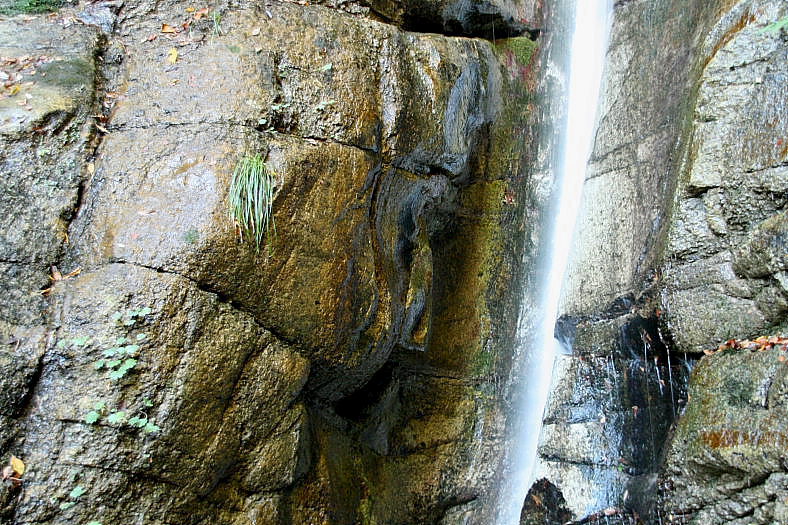 神爾(しんじ)の滝 2008/11/13 滋賀県大津市比良山神爾谷 落差:雄滝17m、雌滝12m 真昼だというのにこの滝前は何と暗いことか。 一筋の光も漏れてこない。 「早うせんと、どんどん暗うなりまっせ〜」 と浅山さんが、も一つお握り食べようとする我輩を急かせる。 午後は山陰になるため2時が限度だ。 「じゃ〜最初「雌滝」を撮ってきま〜す」 と我輩はフィックスロープの付いている雌滝滝壺に下りることにした。 「フィックスロープに何かあったら上から垂らして〜」 と先日買ったばかりの20mザイルは残して行くことにした。 |