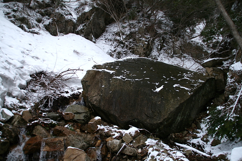 この大岩が目隠しのようになっているが、水の流れ出してくる側からその後を覗くと4段程の段瀑が見えた。