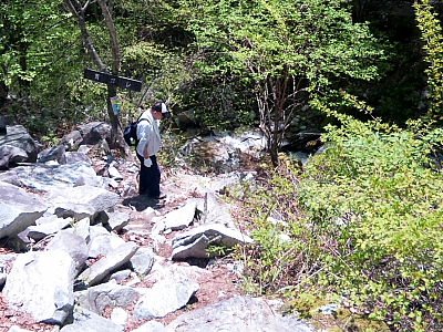 大満足で「金糞滝」の二本の滝を終え”青ガレ”の下から沢を渡ろうと帰路に着く京の滝紀行の(峰さん)。
