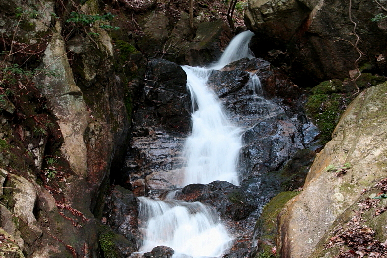 「雄滝」滝壺右岸下の大岩から90度流れを変えて滑滝となって落ちてくる滝頭からの流れはかなり迫力ある箇所なのだが下流から撮ると迫力が伝わらない。