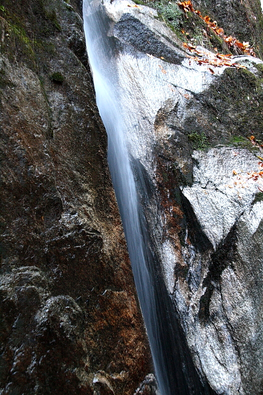 斧研の滝(よきとぎのたき)2009/11/25 滋賀県大津市上田上牧町 大戸川支流 斧研谷 落差:下の滝:3m、斧研の滝:8m、上の滝:13m、上流滑滝 主瀑「斧研の滝」上に「上の滝」が落ちているが「斧研の滝」滝壺からは見えない。 話は(ニジマス)釣り場のおやじの話に戻るが、かつて台風で景観が変わる前は、この滝の滝壺は今では想像できない程の広さと美しさがあったが砂と岩で埋まってしまったと話してくれた・・・。 我輩が勝手に想像するに「下の滝」の積み上げたような石の滝はその当時存在しなかったのではと想像すると、その当時の情景が描けるように思えロマンを誘った。 「斧研の滝」右岸に見えている「上の滝」に通じる高巻先は「上の滝」上流の「上流滑滝」の見える渓流脇路に出た。 「上流滑滝」を探った後「上の滝」を探りに帰り、「上流滑滝」と「上の滝」の間にもう1段滝がある様子なのだが急朔な斜面に適当な降下ポイントが無い。 何とか降下してみようと試みるも下流側の「上の滝」の滝壺に出ることになった。 ロープで強引に降りるより方法がないようだ。 |