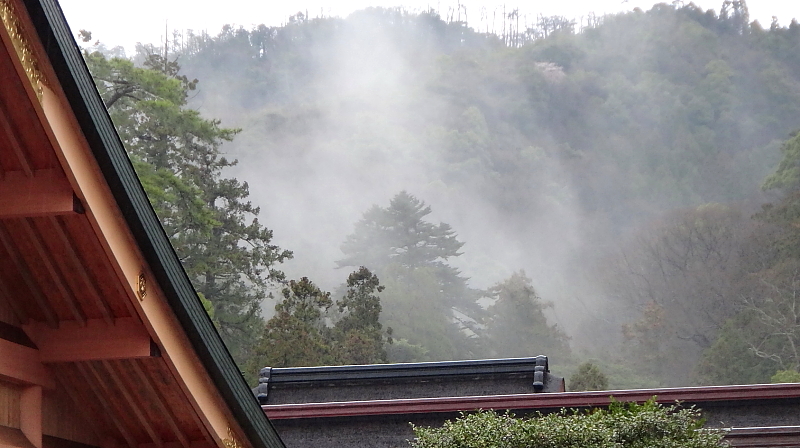 本殿裏の八雲山に霞がかかり神々しくみえた・・・