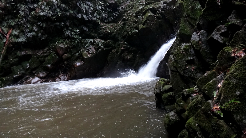 「雌滝」滝壺左岸には雨でぬれて滑る5m程のタラップを降りるが横顔しか見えない。