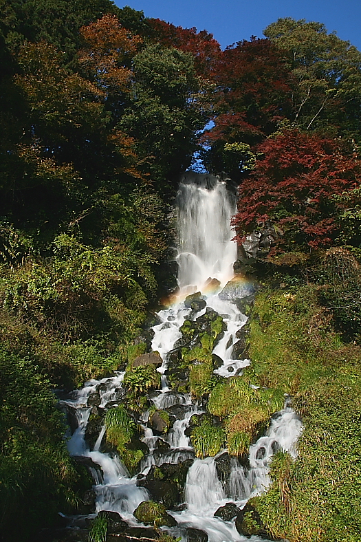 朝日滝 2007/11/25 静岡県富士宮市半野 芝川支流 落差:20m 滝の向き=南 8時40分この場所(熊久保農村公園)に到着し桜やモミジとの組み合わせが楽しめる滝でもあるときき何とも羨ましく思った。 調べてみると百選の「白糸の滝」は富士山の西南に位置し、一帯の豊富な水は小さな発電所が多く存在することからも覗われる。 その白糸の滝から2Kmくらい南西の「朝日滝」の水源は半野用水という江戸時代前に芝川の上流から水を引いた言わば人造川で朝日滝橋からすぐ東に滝口が落ちる。 芝川は白糸の滝主瀑の水源でもあることより同根の滝ということになる。 現在この半野川より取水している東京発電、半野発電所がこの下流にありそのあまり水が公園に落ちる朝日滝だという。 |