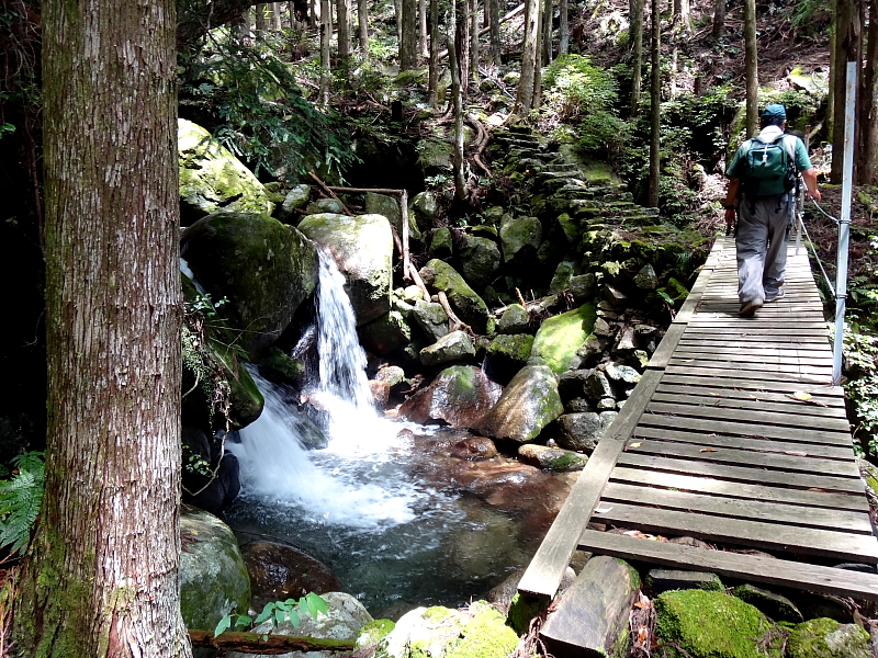 右手の懸川の水量は豊富で二つ目の堰堤を越えて直ぐに木橋で左岸に渡る。