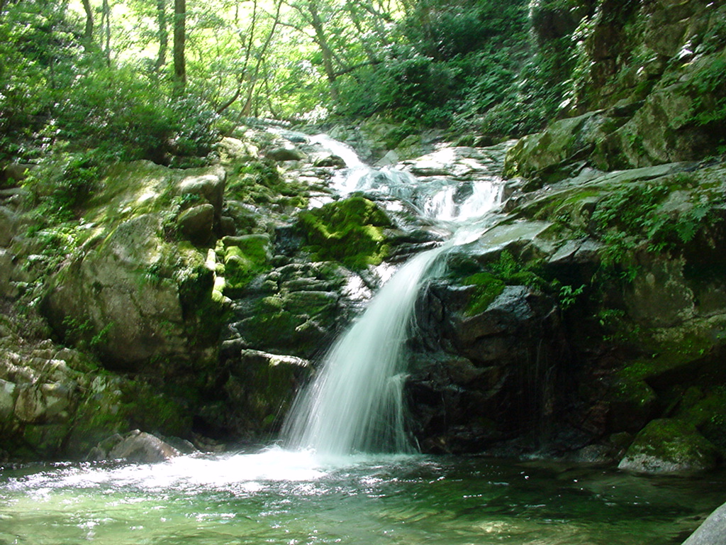 八ツ淵の滝(やつぶちのたき) 2005/08/29 「大摺鉢」 滋賀県高島市黒谷 滋賀県の湖西地方と京都を分ける比叡山(848m)は有名だ。 その北に蓬莱山(1174m)があり更に北の武奈ケ嶽(1214m)が湖西の最高峰だ。 比良山系のほうが名の通りがよい。 八ツ淵の滝はこの武奈ケ嶽の東におちる。