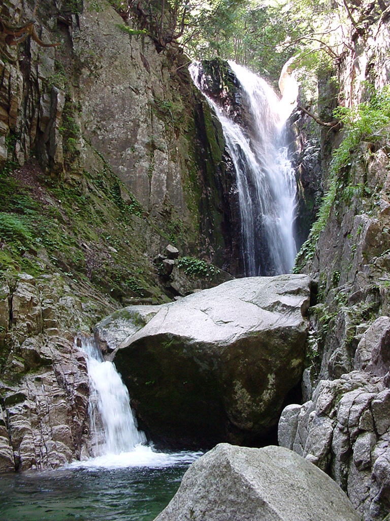 八ツ淵の滝(やつぶちのたき) 2005/08/29 滋賀県高島市黒谷 主瀑:貴船ヶ淵落差:約30m 「貴船ヶ淵」ではちょっとしたアドベンチャー気分が味わえる。 滝前の5mくらいの岩壁を鎖を掴んで滝壷に降り更に渓流を鎖を伝って岩の上をジャンプして対岸に渡ると滝全体のビューポイントだ。慣れないと鎖に体重を預けることを躊躇する。裏皮の手袋のほうが滑りがなくて鎖の掴みが安定する。綿の軍手は岩では問題ないが鎖では滑って危険だ。 「大摺鉢」「貴船ヶ淵」ともに渓谷が薄暗いので撮影は正午前後がいい。