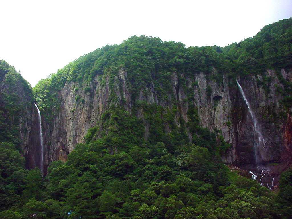 米子大瀑布(よなこだいばくふ) 2004/07/18 長野県須坂市米子町 不動滝(右:落差85m)・権現滝(左:落差75m)二滝の総称が米子大瀑布。 米子川源流、四阿山の北麓の懸崖に並んでいる。 権現滝(左)が豪快に落ちる男性的なイメージ。不動滝(右)は柔らかな滝しぶきが舞い上がるような霧状の滝で不動行者の水行の霊場。 駐車場から、遊歩道を約800M(2〜30分)登ると、分伎して「不動滝」と「権現滝」。 お堂から坂を下ったところで右折し米子川の2つの橋を渡り、硫黄鉱山跡地の台地に至ると米子大瀑布全景の絶好のビューポイントのこの場所に出る。 地元の人によれば、ベストは秋の紅葉シーズンだそうだ。 鉱山当時(昭和9年〜昭和35年)はこんな山奥に1500人もの人が住み、学校や保育所、診療所まであったという。 滝下の木の間に見える空色の屋根が『タキヤマ館』人数がまとまれば宿泊できるようだが・・・。 須坂市への帰路、戸隠仕込手打そば『高井野』で、戸隠のそば粉の格別の風味を味わう。 須坂駅近くのシティーホテル・サンシャインエイト須坂市大字須坂字宗石1210Tel:026-245-8121に投宿。 駅近くはナイトライフも手軽だが、往年のにぎわいはないという。 |